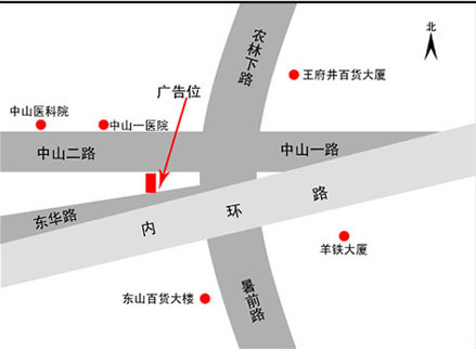 地理位置说明: 该广告牌位于内环路中山路与农林下路交界西南角东山区人民医院楼顶。中山路是广州市东西向的三大主干道之一,农林下路商圈是广州市北京路步行街外的重要商业区,农林下路与中山路交界处的人流、车流量非常大。内环路上更是车水马龙。该广告牌位于建筑物楼顶,广告画面正对受众视线,迎面而至,视冲击力强,信息传播效果显著,是商家进行宣传的理想之选。