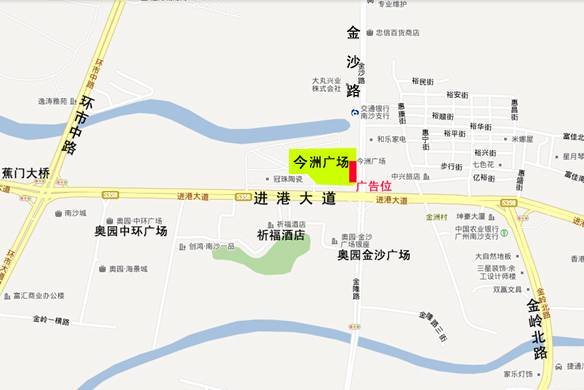 广告位置:广州南沙进港大道金沙路交界今洲广场东侧广告A位